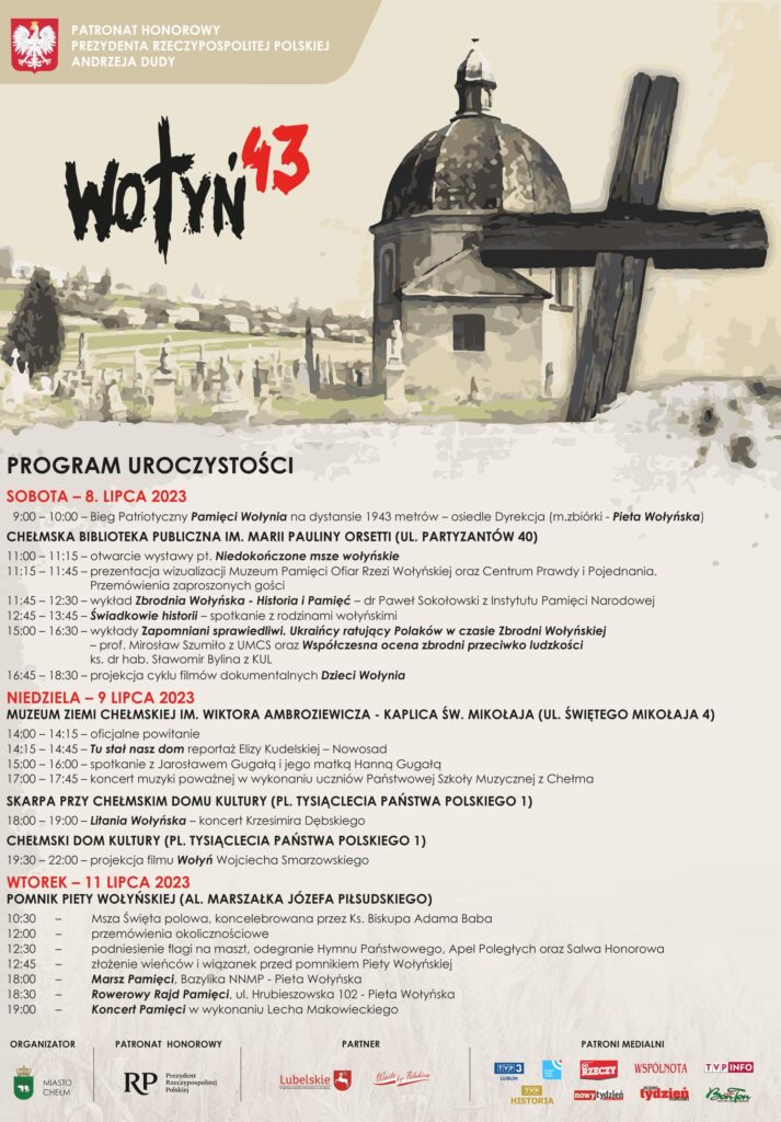Obchody 80. rocznicy „krwawej niedzieli”, upamiętniające ofiary ludobójstwa na Wołyniu w latach 1943–1944 zaplanowano na trzy dni (7–8, 11 lipca 2023 roku). Program obfitował w podniosłe wydarzenia jak odsłonięcie Skweru im. Ofiar Rzezi Wołyńskiej czy prezentacja wizualizacji Centrum Prawdy i Pojednania – Muzeum Ofiar Rzezi Wołyńskiej. Zaprezentowano wystawy przygotowane przez Oddziałowe Biuro Edukacji IPN w Lublinie „Sąsiedzka krew. Ludobójstwo wołyńsko-galicyjskie 1943–1945” oraz „Niedokończone msze wołyńskie. Martyrologium duchowieństwa wołyńskiego”. W spotkaniach „Świadkowie historii” wzięły udział osoby uratowane z rzezi wołyńskiej oraz ich potomkowie. Do udziału w części prelekcyjnej zaproszono dr Pawła Sokołowskiego IPN, dr hab. Mirosława Szumiło prof. UMCS, ks. dr hab. Sławomira Bylinę KUL, Jarosława Gugałę dziennikarza. Wydarzenia uświetniły koncerty muzyki klasycznej w wykonaniu dr hab. Agnieszki Szulz-Brzyskiej (fortepian) i Magdaleny Maciąg (skrzypce) oraz koncert Orkiestry Kameralnej Primuz pod dyrekcją Krzesimira Dębskiego z towarzyszeniem Chóru Ziemi Chełmskiej „Hejnał” oraz solistów: Ireny Ilczyszyn i Kacpra Andrzejewskiego. W programie koncertu zaprezentowano „Litanię Wołyńską” do słów chełmskiego poety Krzysztofa Kołtuna. W ostatnim dniu odbyły się uroczystości o charakterze religijno-patriotycznym (msza, przemówienia gości, złożenie wieńców). Obchody zakończono koncertem Lecha Makowieckiego złożonym z autorskich pieśni i piosenek o tematyce patriotycznej.